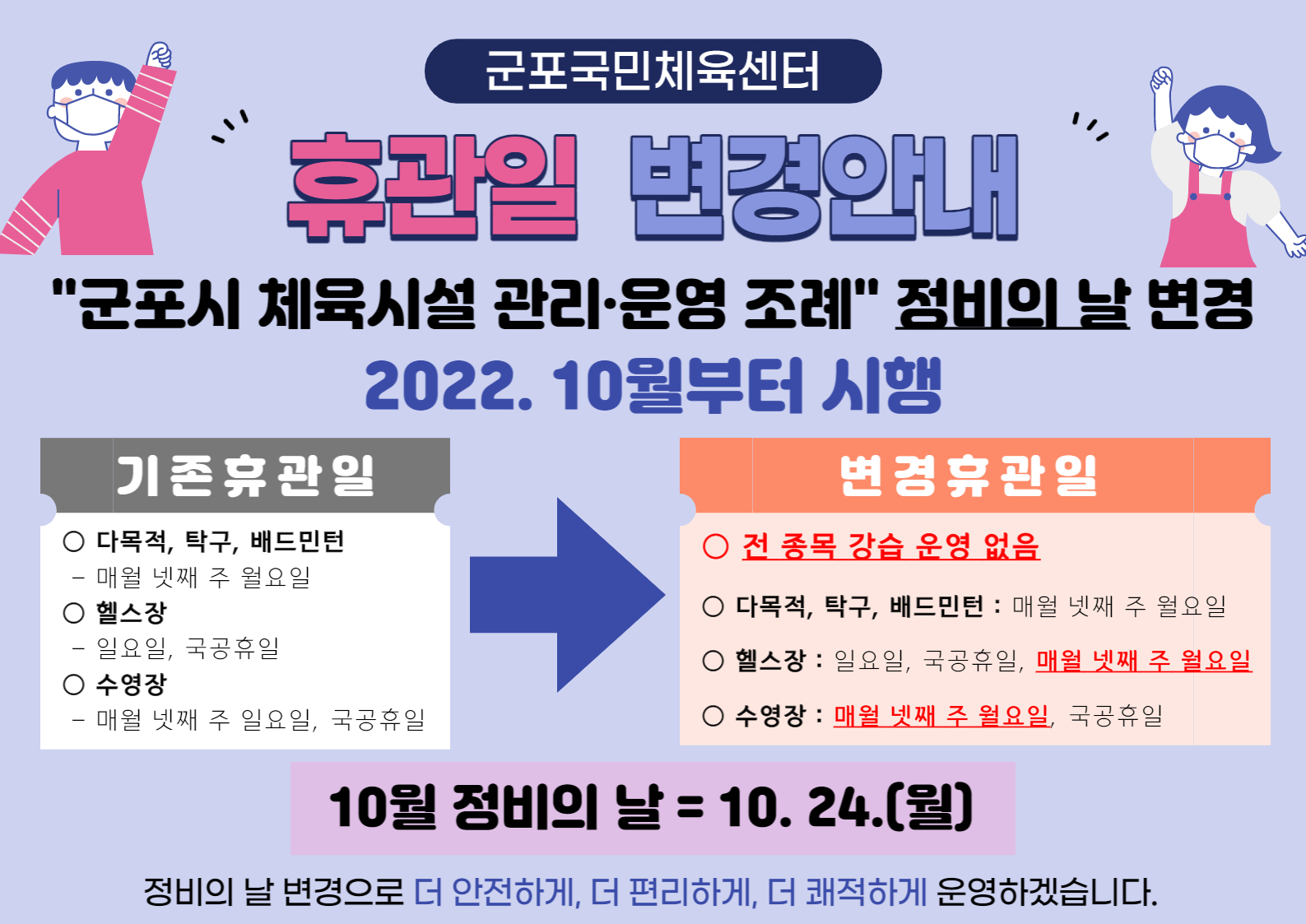 체육레저부 [군포국민체육센터] 휴관일 변경안내 작성자 국민체육센터 등록일자 2022년 10월 6일 10시 7분 10초 조회 774 군포국민체육센터 정비의 날 변경 안내.jpg [ Size : 647.61KB , Down : 740 ] 미리보기 다운로드 목록보기