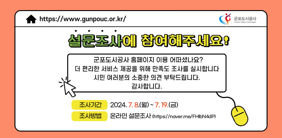http://gunpouc.or.kr/ 군포도시공사 설문조사에 참여해주세요! 군포도시공사 홈페이지 이용 어떠셨나요? 더 편리한 서비스 제공을 위해 만족도 조사를 실시합니다. 시민 여러분의 소중한 의견 부탁드립니다. 감사합니다. 조사기간: 2024.7.8.(일)~7.19(금) 조사방법: 온라인설문조사 (https://naver.me/FHlbN4dP)