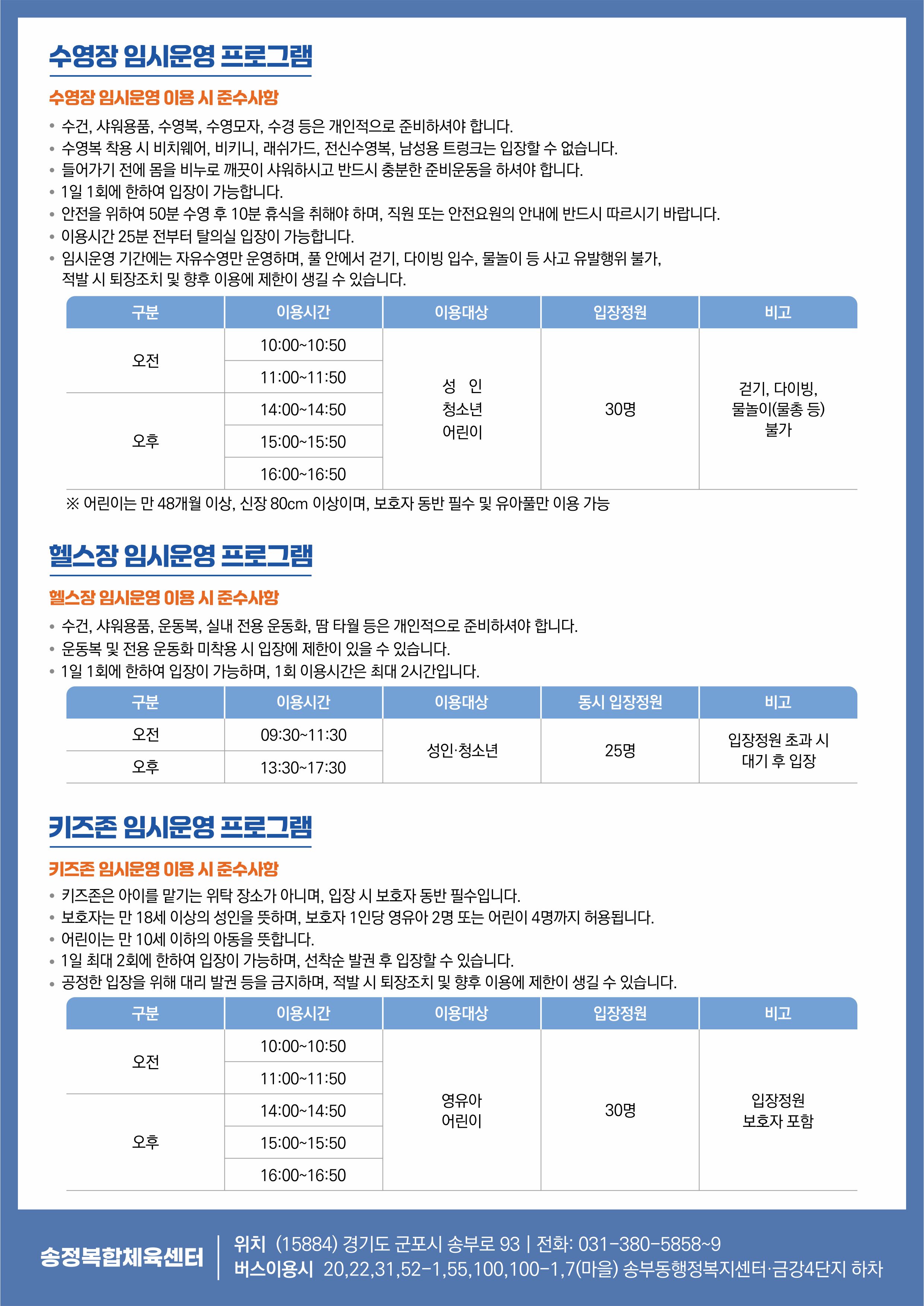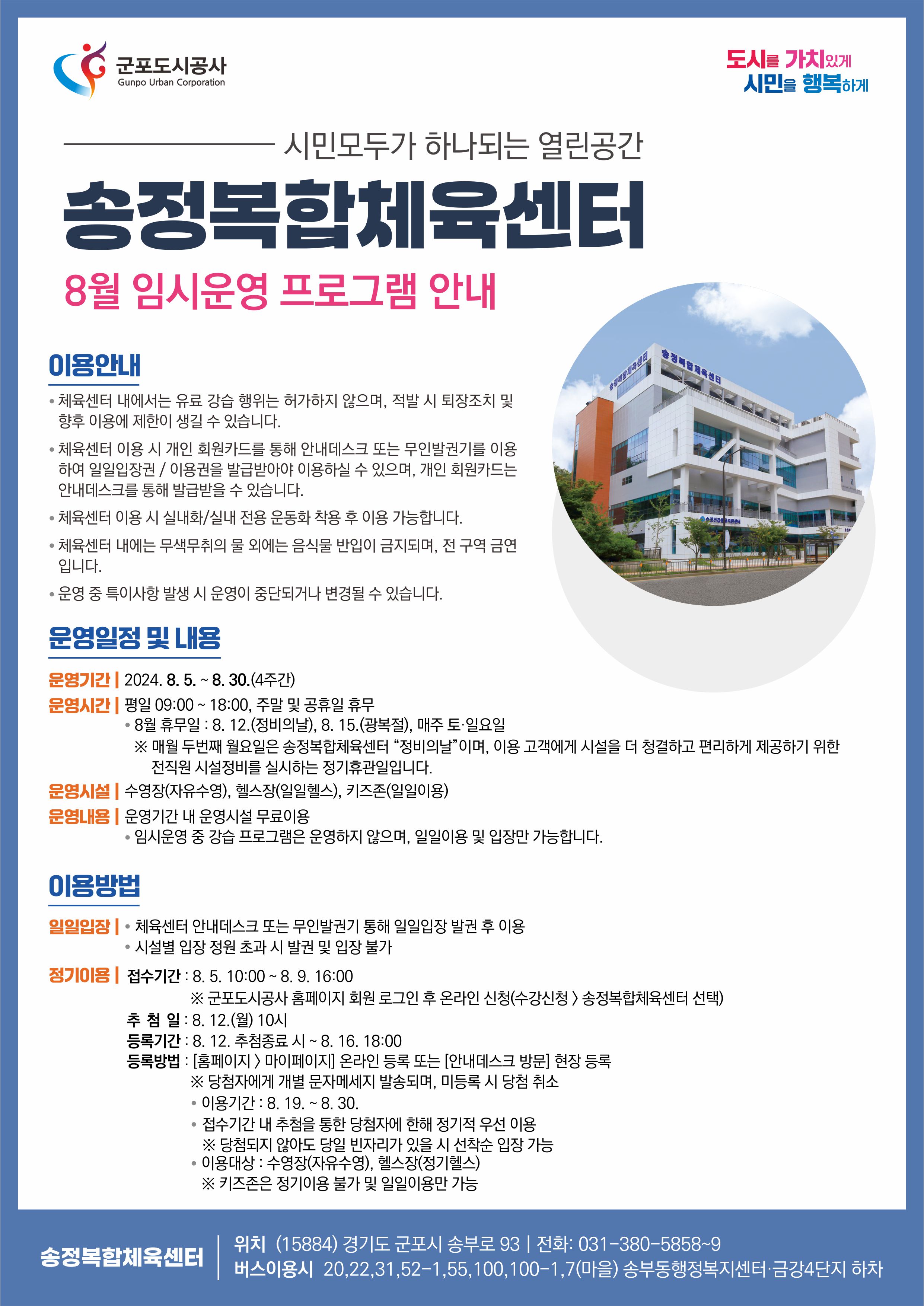 군포도시공사 도시를 가치있게 시민을 행복하게 시민모두가 하나되는 열린공간 송정복합체육센터 8월 임시운영 프로그램 안내 이용안내 체육센터 내에서는 유료 강습 행위는 허가하지 않으며, 적발 시 퇴장조치 및 향후 이용에 제한이 생길 수 있습니다. 체육센터 이용 시 개인 회원카드를 통해 안내데스크 또는 무인발권기를 이용 하여 일일입장권/이용권을 발급받아야 이용하실 수 있으며, 개인 회원카드는 안내데스크를 통해 발급받을 수 있습니다. 체육센터 이용 시 실내화/실내 전용 운동화 착용 후 이용 가능합니다. 체육센터 내에는 무색무취의 물 외에는 음식물 반입이 금지되며, 전 구역 금연 입니다. 운영 중 특이사항 발생 시 운영이 중단되거나 변경될 수 있습니다. 운영일정 및 내용 운영기간 2024. 8. 5. ~ 8. 30.(4주간) 운영시간 평일 09:00 ~ 18:00, 주말 및 공휴일 휴무 8월 휴무일 : 8. 12.(정비의날), 8. 15.(광복절), 매주 토·일요일 ※매월 두번째 월요일은 송정복합체육센터 “정비의날"이며, 이용 고객에게 시설을 더 청결하고 편리하게 제공하기 위한 전직원 시설정비를 실시하는 정기휴관일입니다. 운영시설: 수영장(자유수영), 헬스장(일일헬스), 키즈존(일일이용) 운영내용: 운영기간 내 운영시설 무료이용 임시운영 중 강습 프로그램은 운영하지 않으며, 일일이용 및 입장만 가능합니다. 이용방법 일일입장 체육센터 안내데스크 또는 무인발권기 통해 일일입장 발권 후 이용 ·시설별 입장 정원 초과 시 발권 및 입장 불가 정기이용 | 접수기간: 8. 5. 10:00~8. 9. 16:00 ※ 군포도시공사 홈페이지 회원 로그인 후 온라인 신청(수강신청 > 송정복합체육센터 선택) 추첨일 : 8. 12.(월) 10시 등록기간 : 8. 12. 추첨종료 시 ~ 8. 16. 18:00 등록방법: [홈페이지〉마이페이지] 온라인 등록 또는 [안내데스크 방문] 현장등록 ※당첨자에게 개별 문자메세지 발송되며, 미등록 시 당첨 취소 이용기간 : 8. 19. ~ 8. 30. 접수기간 내 추첨을 통한 당첨자에 한해 정기적 우선 이용 ※ 당첨되지 않아도 당일 빈자리가 있을 시 선착순 입장 가능 이용대상: 수영장(자유수영), 헬스장(정기헬스) ※ 키즈존은 정기이용 불가 및 일일이용만 가능 송정복합체육센터 위치 (15884) 경기도 군포시 송부로 93 | 전화: 031-380-5858~9 버스이용시 20,22,31,52-1,55,100,100-1,7(마을) 송부동행정복지센터·금강4단지 하차