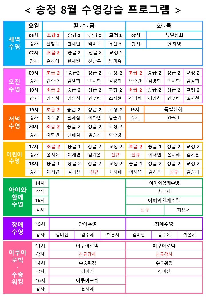 체육관리부 [송정복합체육센터] 2025년 8월 강습 프로그램 일정 및 회원모집 안내