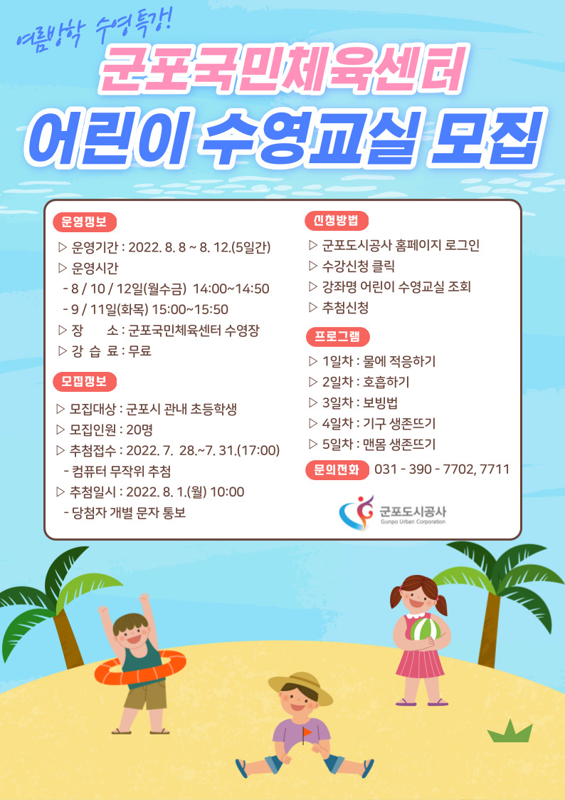 체육레저부 군포국민체육센터 어린이 수영교실 모집(수정) 작성자 국민체육센터 등록일자 2022년 7월 28일 9시 1분 36초 조회 611 ※ 운영시간이 변경되었습니다!! 어린이 수영교실 모집 포스터(수정).jpg [ Size : 260.05KB , Down : 391 ] 미리보기 다운로드 목록보기