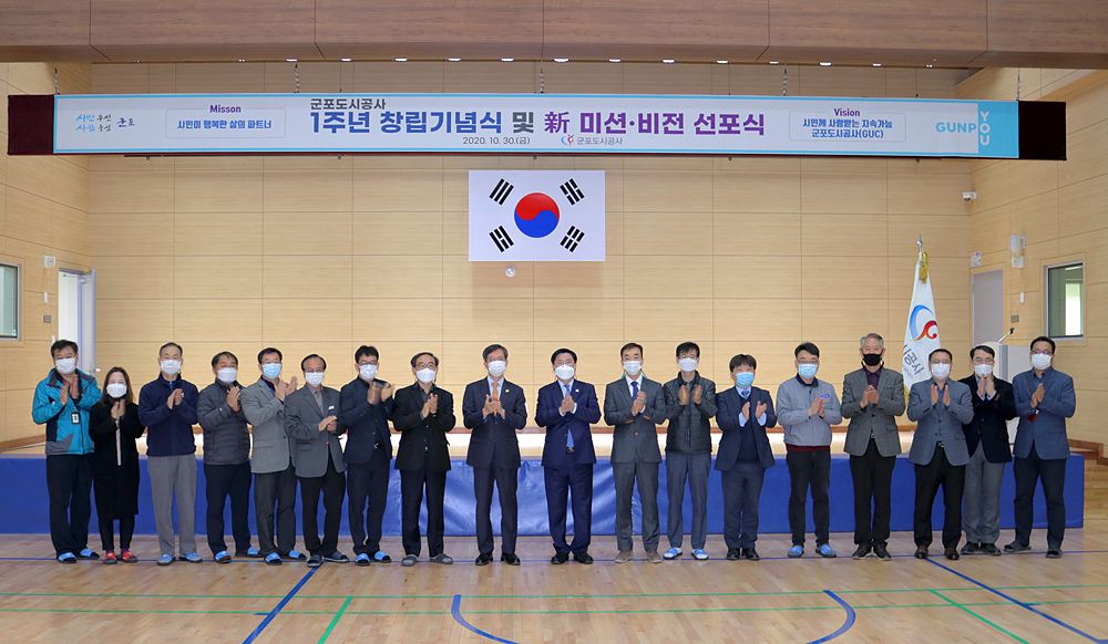 군포시의 지역개발과 시민의 복리증진에 기여해온 군포도시공사(사장 원명희)가 창립 1주년(11월 1일)을 맞아 10월 30일 오후 3시에 군포국민체육센터에서 군포시장(시장 한대희) 및 도시공사 임직원 약 50명이 참석한 가운데 창립 기념식을 개최했다.