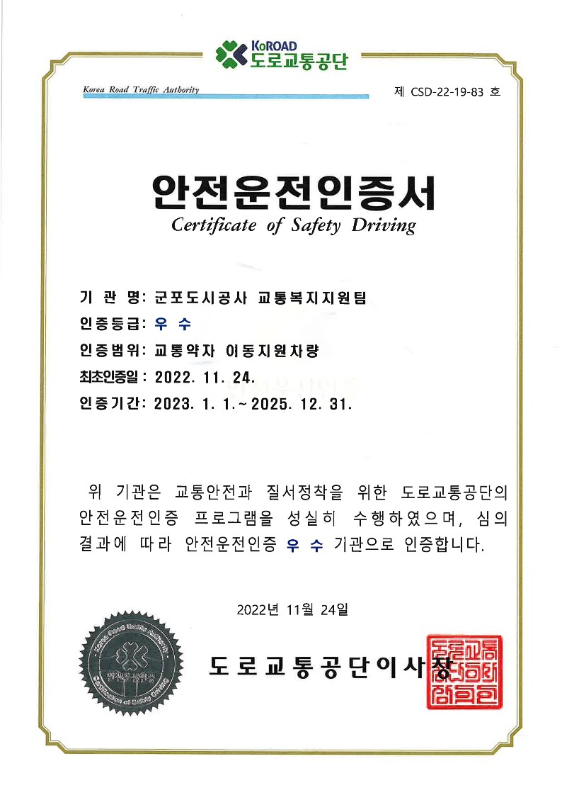 군포도시공사 교통복지지원팀은 2021년 도로교통공단과 MOU를 체결하고 2022년 안전운전인증 취득을 위해 기초안전컨설팅, 안전운전교육, 위험운전자 관리, 운행안전 현장진단, 인증 심의 등의 단계별 절차를 1년간 수행하여 우수한 평가를 받았다.