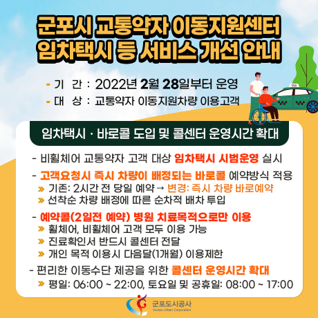 군포도시공사(사장 원명희)에서 운영하는 군포시교통약자이동지원센터는 오는 2월 28일부터 임차택시 시범운영(3대), 바로콜 도입, 콜센터 운영시간 확대를 통해 교통약자이동지원 서비스를 대폭 개선하여 운영한다고 밝혔다.