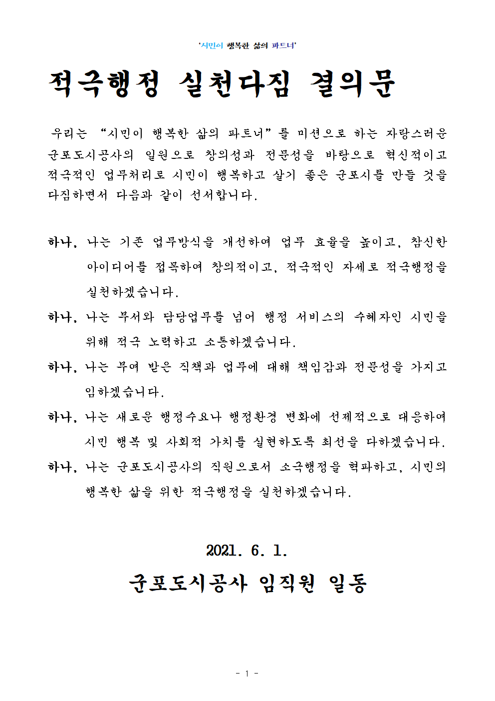 2021년 적극행정 실천다짐 결의대회 작성자 CS담당자 등록일자 2021년 6월 3일 14시 12분 59초 조회 345 2021. 6. 1. (화) 적극행정 실천다짐 결의대회 군포도시공사는 적극행정 실천다짐 결의대회를 개최했습니다. 임직원을 대표한 직원 2인이 “시민이 행복한 삶의 파트너”를 미션으로 하는 시민우선 적극행정 실천을 위한 결의문을 낭독했습니다.시민의 입장에서 소통하고, 더 편리하게, 더 안전하게, 더 쾌적하게 서비스를 제공하여 시민께 사랑받는 지속가능한 군포도시공사가 되겠습니다. 1.png [ Size : 2.19MB , Down : 136 ] 미리보기 다운로드 2.JPG [ Size : 4.54MB , Down : 124 ] 미리보기 다운로드 3.JPG [ Size : 4.79MB , Down : 125 ] 미리보기 다운로드 4.png [ Size : 47.47KB , Down : 122 ] 미리보기 다운로드 목록보기