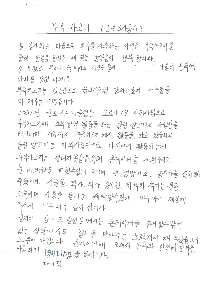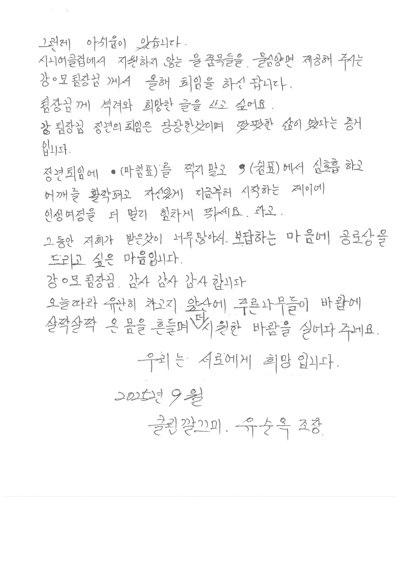 부곡버스공영차고지 강0모 팀장님 감사합니다. 작성자 이남효 등록일자 2025년 9월 22일 16시 18분 27초 조회 148 부곡버스공영차고지에서 활동하시는 어르신들의 안전과 편의를 위한 지원에 감사드립니다. 부곡버스공영차고지에 대한 감사인사_1.jpg [ Size : 330.77KB , Down : 141 ] 미리보기 다운로드 부곡버스공영차고지에 대한 감사인사_2.jpg [ Size : 240.58KB , Down : 123 ] 미리보기 다운로드 목록보기
