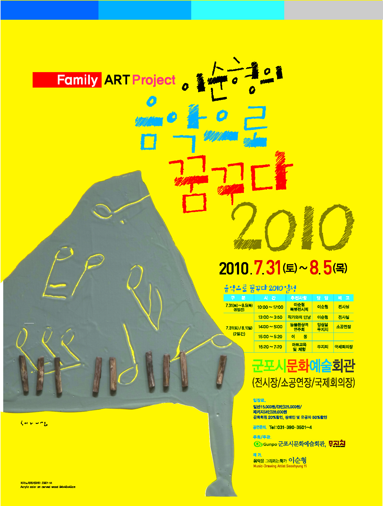[군포시문화예술회관]음악으로 꿈꾸다 2010 작성자 등록일자 2010년 7월 1일 11시 6분 20초 조회 8,509 제 목 : 『 음악으로 꿈꾸다 2010』 공연기간 : 2010. 7. 31 토 ~ 2010. 8. 1 일 시 간 : 10:00 ~17:00 장 소 : 소공연장 가 격 : 일반 10,000원 / 패키지(3인) 18,000원 / 패키지(4인) 20,000원 / 아트체험 별도 입장제한 : 만 24개월이상 포스터.jpg [ Size : 1.18MB , Down : 170 ] 미리보기 다운로드 전단표지.jpg [ Size : 1.18MB , Down : 191 ] 미리보기 다운로드 목록보기