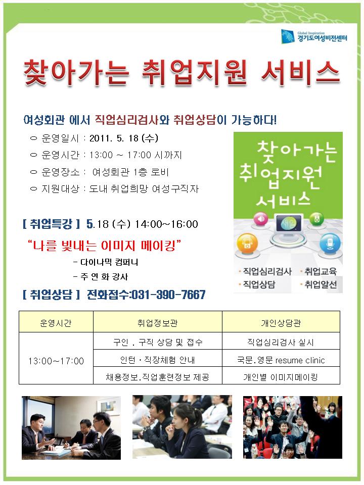 [여성회관] 찾아가는 취업 지원 서비스 작성자 등록일자 2011년 5월 2일 17시 33분 52초 조회 7,195 "찾아가는 취업지원 서비스" ○ 운영일시 : 2011. 5.18(수) ○ 운영시간 : 1300 ~ 17:00시 ○ 운영장소 : 여성회관 1층 로비 ○ 지원대상 : 취업희망 여성구직자 ※ 자세한 내용은 첨부물에 등록되어 있습니다. ○ 전화접수 : 031-390-7667 슬라이드1.JPG [ Size : 116.28KB , Down : 159 ] 미리보기 다운로드 목록보기