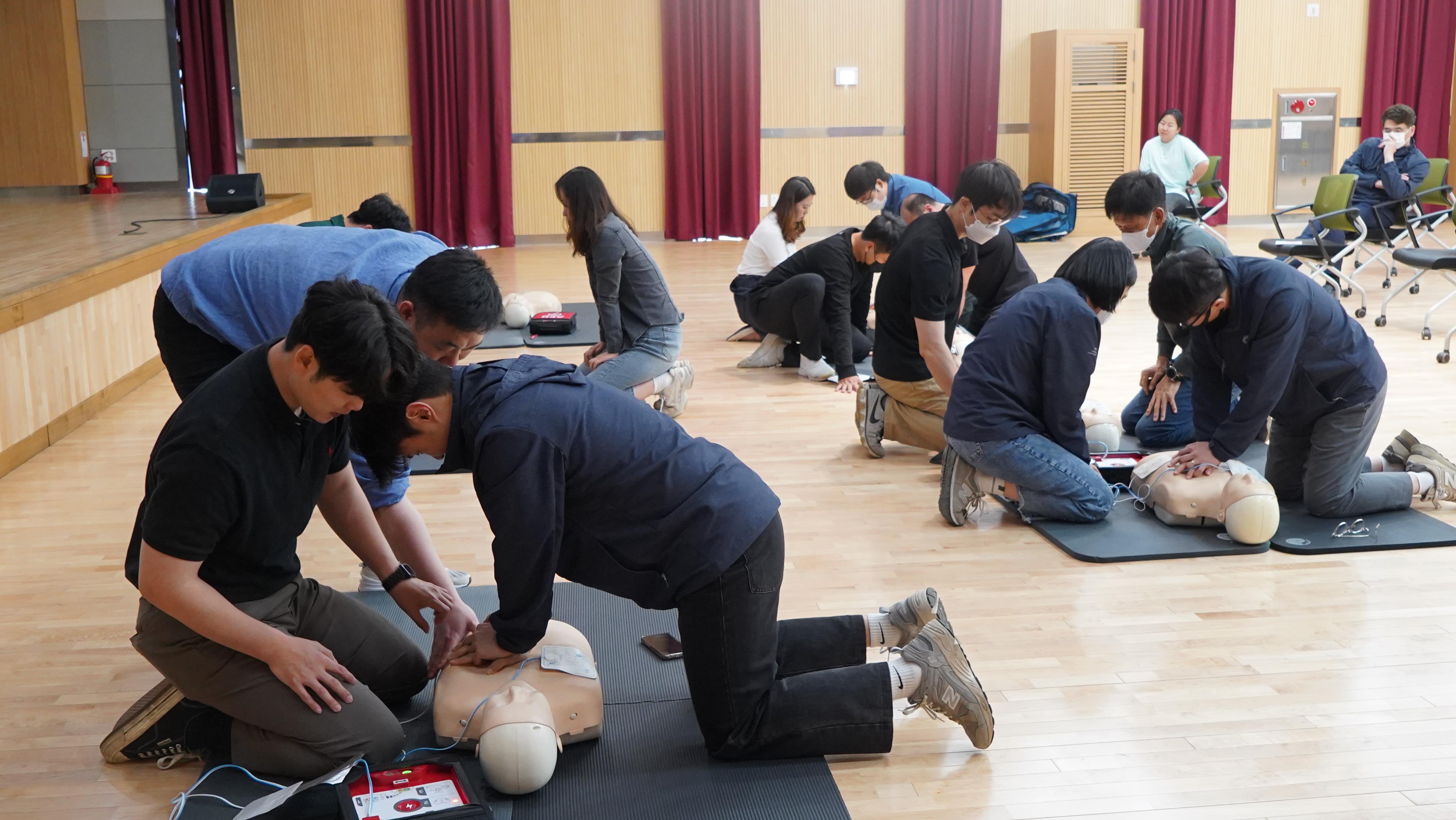 □ 이날 교육은 ▲골든타임 4분의 중요성 ▲119 신고요령 ▲마네킹을 이용한 올바른 심폐소생술 훈련 ▲자동심장충격기(AED)의 사용법 등을 바탕으로 이론과 실습으로 진행하였다.
